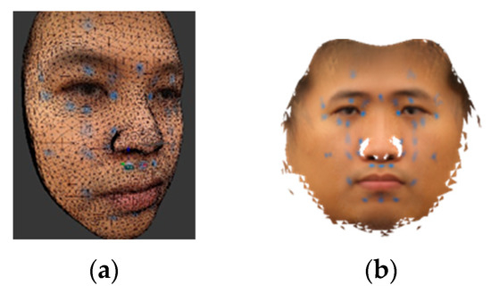 Face images from a large number of subjects with different face angels should be captured, and blue stickers put on their faces to annotate the acupoints. To define an acupoint reference model, a mean face for thirteen different face angles will be built, and all mean faces then merged into an isomap texture, as shown in Figure 3b. The texture and mean model of the 3DMM are then loaded into the 3D graphics software. For every acupoint, the 3D coordinates of the center point of the blue sticker and its three nearest vertices are marked. The coordinates of the landmark points are marked as well.