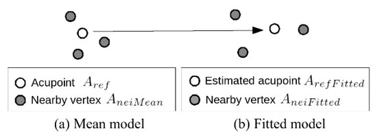 As shown in Figure 4, since the reference acupoints Aref are only available in the mean model, the actual acupoint location ArefFitted in the fitted model will be estimated using the nearby vertices as the control points (see Equations (1) and (2)).