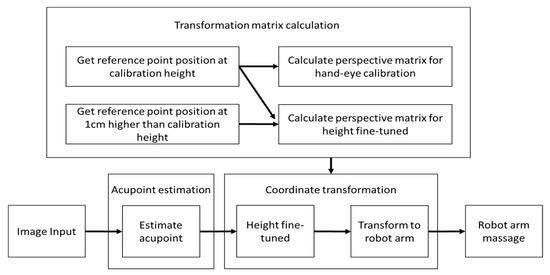 The present system can be divided into three big parts—acupoint estimation, transformation matrix calculation and coordinate transformation. Transformation matrix calculation estimates the matrix used by coordinate transformation and only performs at the first time of setting up the system (Figure 7). The camera first reads an image as input, and then moves to the acupoint estimation part (as discussed in the previous acupoint localization section) to get the image coordinates of the acupuncture points. Then, the acupoint image coordinate is passed to the coordinate transformation part to get the robot arm coordinates of the acupoints.