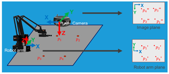 Finally, it can be converted to , and Equation (4) is used to find the least squares solution of the perspective transformation. We apply perspective transformation to the camera and robot arm to conduct hand-eye calibration, as shown in Figure 8. We take the image plane as the original coordinate and the robot arm plane as the destination coordinate, in order to calculate perspective matrix (6,7).