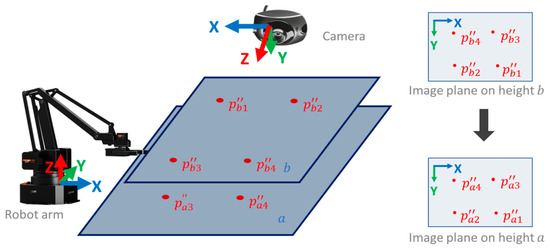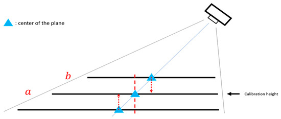 Therefore, perspective transformation is again applied to the image plane at a different height to obtain the fine-tuned height matrix as shown in Figure 10. The image plane is taken at the calibration plane height (plane a) as the original coordinate and the image plane at the height higher than the calibration height (plane b) as the destination coordinate to calculate perspective matrix , as shown in Figure 10.