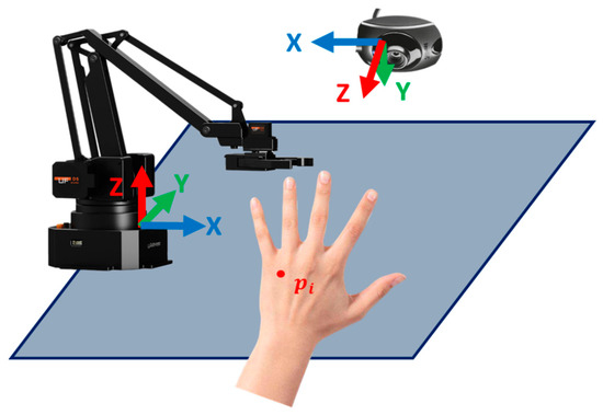 Combining Equations (7) and (8), we get Equation (9), which converts the acupoint from the image space to the robot arm space, as shown in Figure 11.