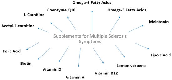 The aim of this review was to collect and critically summarize the current literature on the effect of supplementation on MS symptomatology and progression. Forty clinical trials were found in PubMed database, after using relative keywords to identify clinical trials that investigated the beneficial effects of dietary supplementation against MS symptomatology and progression. The clinical trials were divided into categories based on the type of supplements (Table 1).