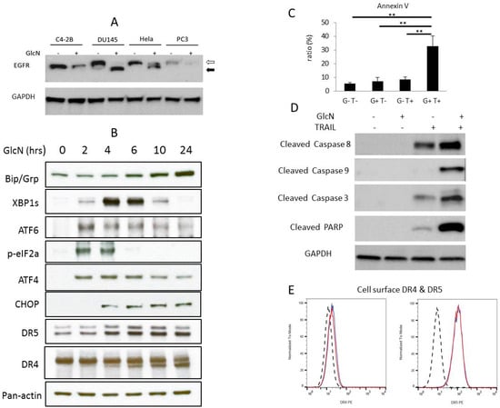 A number of cellular stress conditions including nutritional deprivation, hypoxia, alterations in protein glycosylation and disturbances of calcium flux can lead to the accumulation and aggregation of unfolded/misfolded proteins in the ER lumen inducing ER stress (unfolded protein response (UPR)) [,]. We first surveyed a variety of prostate cancer cell lines and HeLa cells to gauge the effects of GlcN-induced inhibition of N-glycosylation (hereafter described as deglycosylation) on EGFR, a known glycosylated protein []. Four cell lines were treated with 2 mM GlcN for 24 h and whole-cell extracts were analyzed by immunoblotting. Only DU145 and HeLa cells demonstrated substantial EGFR deglycosylation products after GlcN treatment (Figure 1A). Therefore, we elected to further study these two cells lines. To evaluate the effects of GlcN on ER stress, DU145 cells were treated with 2 mM GlcN for 2–24 h and whole-cell extracts were analyzed by immunoblotting as shown in Figure 1B. The ER stress sensor Bip/Grp78 initiates UPR via activation of three pathways: protein kinase PKR-like endoplasmic reticulum kinase (PERK), inositol-requiring protein 1a (IRE1) and activating transcription factor 6 (ATF6) []. The expression of Bip/Grp78 and the downstream protein targets of all three pathways of UPR (p-eIF2a, XBP1s and ATF6 50 kDa, respectively) were increased by the treatment of GlcN in a time-dependent manner with differing kinetics (Figure 1B). PERK phosphorylates eukaryotic initiation factor 2 (p-eIF2a) which inhibits global translation but promotes translation of selective mRNAs such as activating transcriptional factor 4 (ATF4). In turn, ATF4 activates the transcription of the ER stress responding gene CHOP which stimulates the expression of DR5 [,]. As shown in Figure 1B, ATF4, CHOP and DR5 protein levels increased after GlcN treatment. Taken together, we concluded that GlcN induced ER stress and enhanced the expression of DR5 in DU145 cells as previously demonstrated in other cell types [].