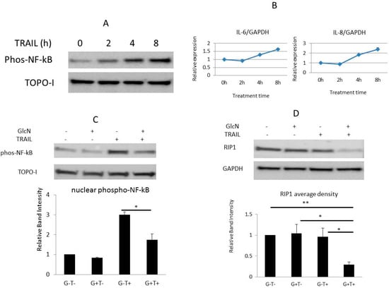 In addition to apoptosis, TRAIL can simultaneously promote cellular survival through nuclear factor kappa B (NF-kB). To investigate whether GlcN is able to suppress the NF-kB signaling, DU145 cells were treated with TRAIL (50 ng/mL) for 2–8 h and nuclear extracts were analyzed by immunoblotting. As shown in Figure 3A, phosphorylation of NF-kB was stimulated in a time-dependent manner, a finding consistent with previous observations [,]. Furthermore, two well-known downstream targets of the NF-kB signaling, IL6 and Il-8 were up-regulated by TRAIL treatment (Figure 3B). These data showed that the NF-kB signaling was activated. Next the effect of GlcN on NF-kB was examined. Our data demonstrated that GlcN alone had no effect on the basal NF-kB activity, while combined GlcN/TRAIL treatment suppressed (p < 0.05) the TRAIL-stimulated NF-kB activation (Figure 3C). Since the presence of RIP1 is required for the TRAIL-induced NF-kB activation, we tested if GlcN/TRAIL treatment suppressed RIP1 expression []. As shown in Figure 3D, RIP1 levels were significantly reduced with GlcN/TRAIL treatment while TRAIL alone did not change RIP1 expression. Taken together, our data support that the GlcN/TRAIL combination suppresses the TRAIL-stimulated NF-kB activation and that GlcN could shift the balance toward apoptosis.
