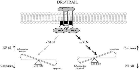 TRAIL is a double-edged sword in terms of its pro-apoptotic and anti-apoptotic properties []. GlcN/TRAIL combination treatment shifts the balance between inflammatory and apoptotic pathways (Figure 5). On one hand TRAIL can activate the apoptotic process through the formation of DISC upon binding to its receptors. On the other hand TRAIL can activate anti-apoptotic processes mainly through the activation of the NF-kB signaling. Our results demonstrated that in the presence of GlcN, TRAIL increased the apoptotic commitment while at the same time suppressing TRAIL-induced NF-kB activation.