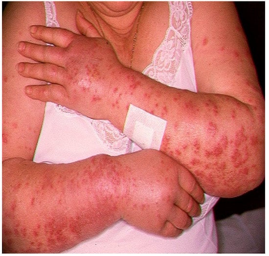 Xerosis and hyperpigmentation in the skin and mucous membranes are the most common skin side effects, while urticarial lesions, maculopapular rashes, and erythroderma are very uncommon []. As already highlighted, one case of DISS related to HCQ was recently reported in a young female patient affected by Sjogren’s syndrome associated with SLE [].