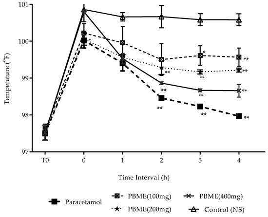 The PBME (100, 200, and 400 mg/kg p.o.) displayed a significant (* p < 0.05) decrease to elevated temperature in a dose-dependent manner (Figure 1). The antipyretic efficacy with the highest significant effect was observed at 2 and 3 h. The 400 mg/kg PBME demonstrated an antipyretic activity that was comparable to the positive control group paracetamol (100 mg/kg).