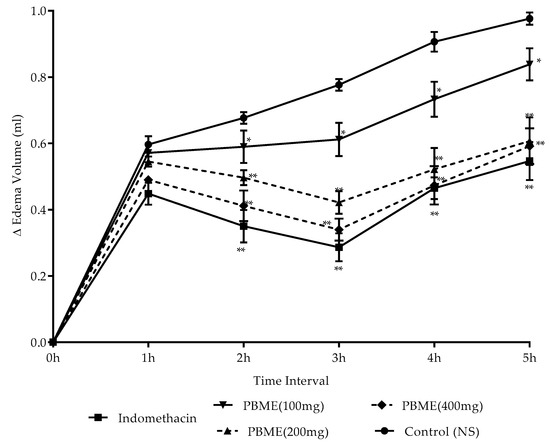 Sub-plantar injection of 1% (w/v) carrageenan on the right hind paw increased the edema volume (Figure 2). However, the pre-dosing of rats with PBME (100, 200, or 400 mg/kg, p.o.) produced a significant (* p < 0.05) decrease in edema volume in a dose-dependent manner. The data revealed the efficacy of PBME (400 mg/kg) is slightly lower, but on a par to indomethacin (10 mg/kg), with highest reduction in paw volume being at 3 h post administration.