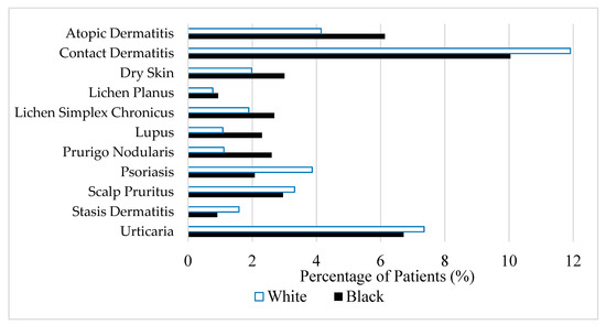 Percentage of white and black patients seen for itch diagnosed with various conditions.