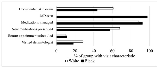 The differences in itch presentation can be explained by both physiologic variation and sociologic causes. To further explore the sociologic differences in pruritus presentation between black and white patients, we compared different visit characteristics in Figure 2 using NAMCS/NHAMCS datasets. Among the itch-related patients, more white patients had a history of a documented skin exam when compared to black patients (61% vs. 43%). Furthermore, white patients with itch symptoms were more likely to visit a dermatologist when compared to black patients with similar concerns, nationally (29% vs. 18%, OR 0.44, p = 0.028).