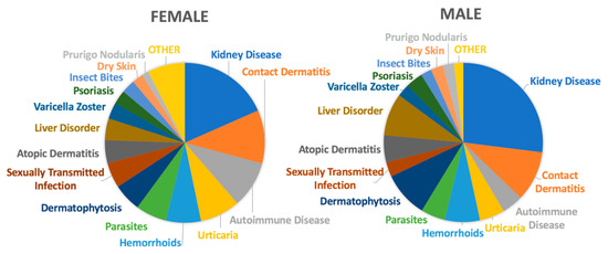 In addition to the racial differences, there are several gender differences, as seen in Figure 3 and Figure 4, that may contribute to our understanding of pruritic symptoms. While autoimmune conditions, urticaria, and sexually transmitted infections are more likely to be associated with pruritus in females, liver and kidney disease, dermatophytosis, and prurigo nodularis are more likely to be diagnosed in males with pruritus. Many of these differences can be attributed to the epidemiology of the conditions themselves. Autoimmune conditions and urticaria both occur more commonly in women, perhaps because of differences in sex hormones and inflammation pathways, which are reflected in our findings [15]. Women are found to progress toward end-stage renal disease at a slower rate than men, thus explaining the gender discrepancy in pruritic presentation with kidney disease [16].
