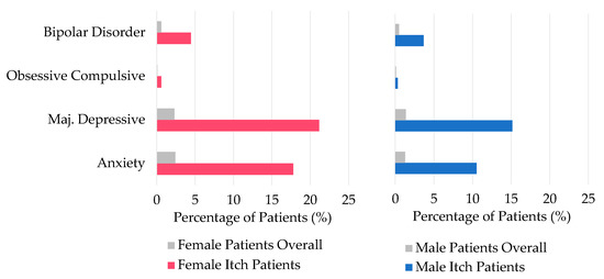 With regard to gender differences in the presentation of pruritus, females and males presented with different diagnoses for their itch symptoms at JHHS, as shown in Figure 3. Females reporting itch symptoms were more likely to be diagnosed with autoimmune conditions (OR 1.66, p < 0.0001), urticaria (OR 1.64, p < 0.0001), and sexually transmitted infections (OR 1.77, p < 0.0001) when compared to males reporting pruritus. However, women were less likely than men with itch to have kidney disease (OR 0.61, p < 0.0001), liver disease (OR 0.49, p < 0.0001), dermatophytes (0.59, p < 0.0001), or prurigo nodularis (0.61, p < 0.0001). Additionally, as shown in Figure 4, when investigating the prevalence of psychiatric comorbidities, both males and females suffering from pruritus were more likely to also be diagnosed with bipolar disorder, obsessive compulsive disorder, major depressive disorder, and generalized anxiety disorder when compared to the general patient population at JHHS (female: OR 7.1–9.6, p < 0.0001; male: OR 4.0–11.3, p < 0.0001). Of note, among the patients seen for pruritus, females are more likely than males to be diagnosed with these psychiatric comorbidities (OR 1.2–1.8, p < 0.0001).