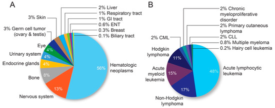 Distribution of malignancies in the pediatric population at JHHS. (A) Frequency of each malignancy subtype among patients age 18 or less. (B) Breakdown of blood malignancies as a percentage of total hematologic cancers. Chronic myeloid leukemia (CML) and Chronic lymphoid leukemia (CLL).