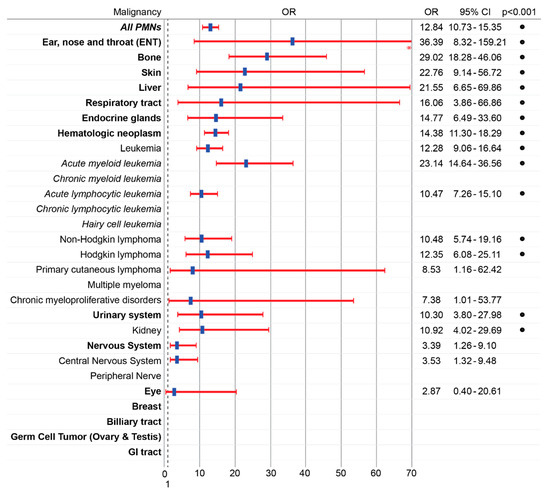 Itching is strongly associated with pediatric malignancies. Odds ratio (OR) with 95% confidence interval (95% CI) of malignancy in patients with compared to without itching in the general pediatric hospital population. Blank rows denote malignancies for which there were no concurrent diagnoses of pruritus. * 95% CI upper limit for ENT (159.2) has been truncated. • = p < 0.001, chi-squared test. Primary malignant neoplasm (PMN).