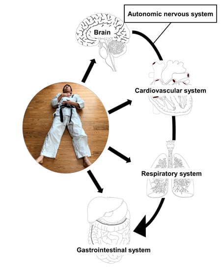 As diaphragmatic (abdominal) breathing (DB) is a slow and deep breathing method, it should not be considered as just a breathing control [7]. Since time out of mind, traditional martial arts such as tai chi and yoga utilize DB in their practice. DB is defined as breathing in slowly and deeply through the nose using the diaphragm with a minimum movement of the chest in a supine position with one hand placed on the chest and the other on the belly [8]. During breathing, practitioners should be careful that chest remains as still as possible and stomach moves against the hand focusing on contracting the diaphragm. Generally, DB practitioners inhale and exhale for approximately six seconds, respectively. DB is a fundamental procedure during meditation practices in individuals who engage in yoga and traditional martial arts such as tai chi. Recently, a systematic review has reported that mind–body exercise (yoga/tai chi) can reduce stress in individuals under high stress or negative emotions by modulating the sympathetic–vagal balance [9]. Martarelli et al. [10] showed that DB increased the antioxidant activity and reduced the oxidative stress after exercise in athletes. DB has a potential to be a non-pharmacological treatment for patients with stress disorder as well as chronic respiratory disease. Although a number of studies have investigated the efficacy of breathing exercises in treating chronic obstructive pulmonary disease (COPD) [11,12,13,14,15,16,17,18,19,20,21,22,23,24,25,26,27,28,29], asthma [30,31,32,33,34,35], postoperative pulmonary function [36,37,38,39,40], and cardiorespiratory performance in post-Fontan patients [41], the effect of DB on other disorders, for example, cancer, heart failure, and anxiety, still needs to be further investigated. As a martial arts practitioner, the author uses DB in daily mind–body exercises (Figure 1) and feels the necessity to assess whether DB has a favorable impact on the overall health. This review aims to summarize the current evidence of the impact of DB on diseases as described above as well as respiratory function and to discuss its future perspective.
