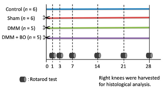 Experimental protocol of the present study. Destabilization of the medial meniscus (DMM) and the sham surgery were performed on the right knee on day 0 (✂). Boiogito (BO) was mixed in the chow at a concentration of 3%. The rotarod test was performed prior to and 1, 3, 7, 14, 21, and 28 days after the DMM surgery. The rats were sacrificed, and their right knees were harvested for histological analysis on day 28.