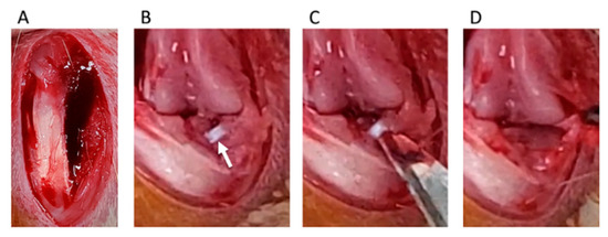 Destabilization of the medial meniscus (DMM) was adopted as a KOA-inducing model [19]. We divided rats into four groups: control, sham, DMM, and DMM + BO-treated groups. DMM and sham surgeries were performed on the right knee fixed in a flexed position under isoflurane (Fujifilm Wako Pure Chemical Corp., Osaka, Japan) inhalation general anesthesia. A skin incision was made in the midline of the right knee to expose the quadriceps muscle and patellar tendon. The medial edges of the patella tendon and medial joint capsule were separated (Figure 2A), and then, the patella was dislocated from the lateral femoral condyle (Figure 2B). The medial meniscotibial ligament (MMTL) was then able to be observed. The MMTL was transected, and the medial meniscotibial joint capsule was horizontally cut in the DMM and DMM + BO groups (Figure 2C) to induce meniscal extrusion out of the bone contact area between the femur and tibia (Figure 2D). No cutting procedure was performed in the sham group. Finally, the medial joint capsule and patella tendon were sutured with 6-0 Vicryl® (Ethicon Inc., Somerville, NJ, USA), and the subcutaneous layer was sutured with 5-0 Vicryl®.