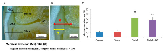 To assess the validity of the DMM operation, the degree of extrusion of the medial meniscus was evaluated. The animals were intraperitoneally anesthetized with pentobarbital sodium (50 μg/kg; Somnopentyl, Kyoritsu Seiyaku, Tokyo, Japan) and intracardially perfused with phosphate-buffered saline at pH 7.4 until all the blood had been removed from the system. After perfusion with 4% paraformaldehyde in 0.1 M phosphate-buffered saline, only the right leg was amputated because the contralateral side of the knee joint may not yet have an osteoarthritic change [20]. Then, the right knee joint was fixed with 4% paraformaldehyde for 3 days and decalcified with a 20% EDTA solution for 21 days. Then, the knee joint was cut in a coronal shape amid and along the medial collateral ligament fiber, and the degree of meniscal lateral deviation out of the outer edge of the femoral condyle was measured by using a Stemi 305 stereomicroscope (Carl Zeiss, Oberkochen, Germany) (Figure 3A). This measurement was performed three times in each sample, and the average of these three was finally defined as the meniscus extrusion (ME) ratio, which is the length of the extruded meniscus/the length of the medial meniscus × 100 (%) [21] (Figure 3B). Specimens with <20% of the ME ratio in the DMM and DMM + BO groups were excluded from this study because they were considered to indicate failure of the DMM surgery.