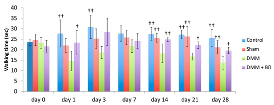 Rotarod performances were assessed prior to and 1, 3, 7, 14, 21, and 28 days after the DMM surgery (Figure 4). In the acute phase (on days 1 and 3), although walking time on the rotarod apparatus was slightly improved in the control group, there was no significant difference. The latencies to fall off the rotarod apparatus (walking time) were significantly lower in the DMM group than in the control group (p < 0.01). However, the decreases were inhibited in the DMM + BO group, especially significant on day 1 (p < 0.05). In the chronic phase (on days 14, 21, and 28), the latencies were significantly lower in the DMM group than in the control and sham groups (p < 0.01) Those decreases were significantly inhibited in the DMM + BO group (on day 14; p < 0.01, on days 21 and 28; p < 0.05). Furthermore, walking time on day 28 in the DMM + BO group had no significant difference than that in the control group.