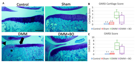 Histological analysis of the medial tibial cartilage. (A) Representative images of coronal sections of the medial tibial plateau stained with toluidine blue. Magnification: * 40. Scale bars = 500 μm Arrow (➡) indicates degeneration of the extracellular matrix in articular cartilage. Asterisk (*) indicates subchondral bone damage. Arrowhead (▶) indicates osteophyte synthesis. (B) OARSI cartilage score. (C) Total OARSI score. Boxplots denote median values and interquartile ranges. Vertical bars show ranges (n = 6 in the control and sham groups, n = 5 in the DMM and DMM + BO groups). The marks indicate a significant difference from the DMM group by the Tukey–Kramer test († p < 0.05, †† p < 0.01 vs. DMM).