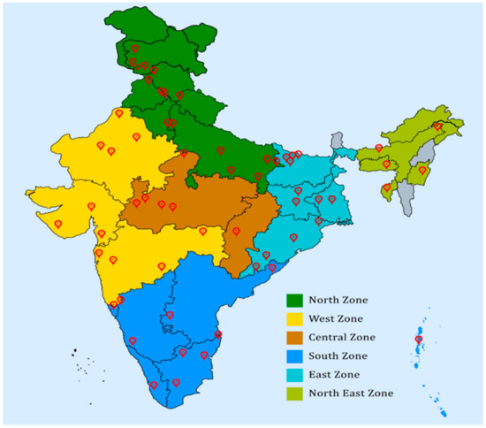 Details of the methodology have been published as two articles [17,18]. In brief, in order to plan the survey, 65 districts from the 30 (out of 35 in India) most populous states and union territories from all six zones (Figure 1) were selected randomly depending on each state’s population density. Further, urban and rural clusters were identified from north, south, east, west, and central areas of each district using randomization. After identifying these clusters, the trained volunteers conducted the study in two phases of screening using a mobile app developed for the purpose by the international research advisory team. The first phase included a short questionnaire to identify individuals with high risk for diabetes and yoga awareness; the second phase included detailed data acquisition from those with high risk. Before the initiation of the study, all the volunteers undertook a six-day training explaining the content and manner of operationalization of the questionnaire, the importance of informed consents, and documentation of all the details in the questionnaire. The volunteers who had not undergone the training were not allowed to be a part of the study.