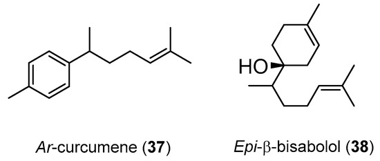 Despite not being so abundant as the compounds referred in Table 3, the isolation of two compounds from H. larsenii rhizomes essential oil could be mentioned, i.e., ar-curcumene (37) and epi-β-bisabolol (38) (Figure 4), that presented insecticide properties against diseases mosquito vectors larvae A. stephensi, A. aegypti and C. quinquefasciatus [94]. The results show that the most affected vector was A. stephensi with compounds 37 and 38 presenting a LC50 values of 51.65 and 66.02 µM, respectively. Unfortunately, the lack of a tested reference compound is a handicap in this work.