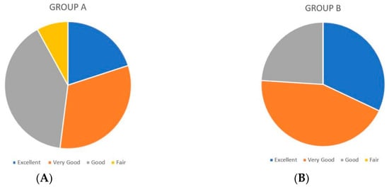 At 12 months post operation, in Group A, 13 patients answered that their result was “very good” (8) to “excellent” (5); ten reported that their result was “good” and two “fair” (Figure 8A). At 12 months, in Group B, 19 patients answered that their appearance was “very good” (11) to “excellent” (8) and six that their appearance was “good” (Figure 8B). The average follow-up time for both groups was 2.3 years. The mean score for the patient satisfaction rate for Group A was 3.72 (SD = 2.29) out of 5 and 4.08 (SD = 2.29) for Group B. The parameters, in descending order, that were most important in this study were the breast symmetry, the final breast shape, and the resulting scar (p < 0.05).