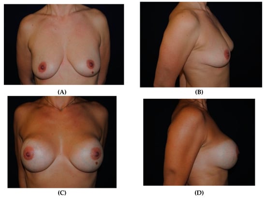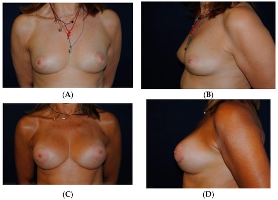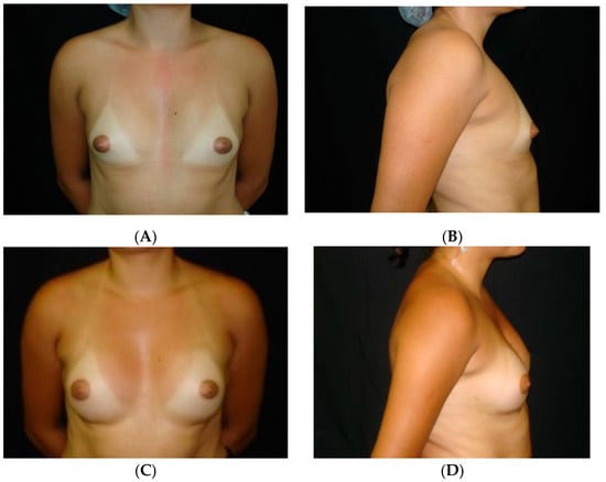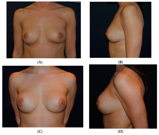 This 24-year-old female patient asked for breast contour enhancement (Figure 9A,B). She was randomly placed into Group A. Bilateral breast augmentation using round high-profile breast implants was done (195 mL). Postoperative views 12 months after the procedure are shown (Figure 9C,D). At 12 months she reported her aesthetic result as very good.