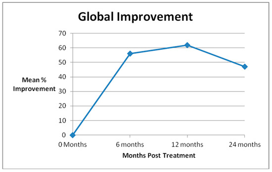 Forty-one of 47 knees (87%) had 6 month follow-up, 38 of 47 knees (81%) had 1 year follow-up, and 22 of 26 knees (85%) had 2 year follow-up. Significant improvement, as measured by the global improvement score, was achieved by 80% of patients at 6 months, 76% at 1 year, and 68% at 2 years after treatment. The global improvement score mean magnitude of improvement was 56% at 6 months, 62% at 1 year, and 47% at 2 years after treatment (Figure 1). Outcome scores are summarized in Table 1.