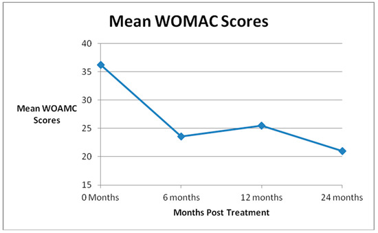 Mean SANE scores (0–100, 100 worst) for all patients demonstrated statistically significant improvements from the pre-injection score of 48.4 to all follow up time points: 29.1 at 6 months, 36.3 at 1 year, and 34.6 at 2 years. (See Figure 2 The mean KOOS-PS scores (0–100, 0 worst) improved significantly from 58.1 for all patients before treatment to 66.8 at 6 months, 66.7 at 1 year, and 67.1 at 2 years. (See Figure 3 The mean WOMAC scores (0–96, 96 worst) declined significantly from 36.2 for all patients before treatment to 24.3 at 6 months, 26.4 at 1 year and 21.0 at 2 years. (Figure 4)The results were statistically significant for all outcome scores at all follow up points. The p value can be found in Table 1.