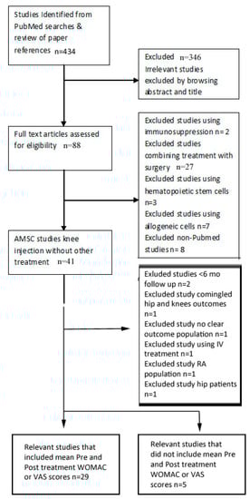 The intra-articular injection of autologous mesenchymal stem cells (AMSCI) has been used in several studies for the treatment of knee osteoarthritis. AMSCIs are used in several forms including stromal vascular fraction (SVF), culture expanded adipose derived stem cells (ASCs), minimally manipulated fat graft (MM Fat), bone marrow aspirate (BMAC), and culture expanded bone marrow (BMSCs). A review of the literature has shown that they are completely safe in this application []. If effective, they would be a valuable tool for the treatment of arthritis. Based on reports in the literature and our own experience, we hypothesized that a comprehensive literature review would show that intra-articular AMSCI is an effective treatment for knee osteoarthritis and that the outcomes would be significantly better than a historical control group of placebo treated patients taken from placebo arms of other knee injection studies for treatment of osteoarthritis. We also hypothesized that there would be a positive dose–response relationship with improved outcomes with increasing dose of cells for treatment among the cohorts.