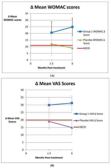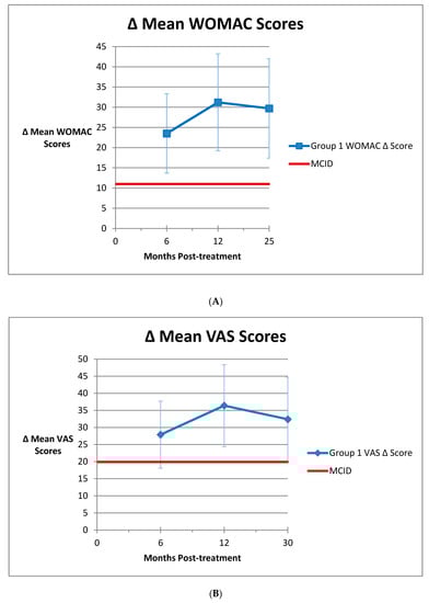 Six study arms of four studies in Group 1 reported changes in WOMAC scores for 6 months, 1 year and some point longer than 1 year [,,,]. The long-term follow-up was a mean of 25 months post-treatment for the WOMAC scores. Figure 2A shows the scores for the 6 studies with intermediate and long-term WOMAC scores. The MCID is indicated in this figure. Nine study arms of seven Group 1 studies reported change in VAS scores for all three points [,,,,,,,]. The long-term follow-up was a mean of 29 months post-treatment for the VAS scores. The mean of these points is shown in Figure 2B. The VAS MCID is indicated in this figure. A comparison of means between the pre-treatment scores and the long term follow-up point showed that the scores were statistically significantly improved (p = 0.001 for WOMAC, p = 0.004 for VAS).