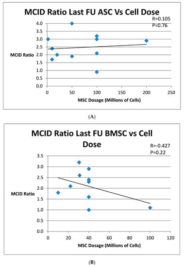 A comparison was performed to see if a dose–response relationship existed between numbers of cells and outcome parameters. For each of the three groups, ASCs BMSCs, and SVF, the MCID ratio at final follow-up was compared to the total number of cells used in treatment. For ASC and BMSC groups, the total number of cells was based on the reported MSC cells. For the SVF group, the reported total nucleated cells (TNCs) were used. A regression analysis was performed. The results are graphed in Figure 4A–C. No statistically significant dose–response relationship was found, and the p values were not significant for any of these groups. Although there was a trend toward decreasing efficacy with greater stem cell dose for both BMSCs and SVF, ASCs showed a slightly increasing efficacy. However, none of these trends were statistically significant.