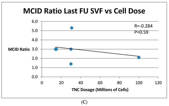 (A) MCID Ratio at Last Follow-up for Cultured ASC vs MSC Dose. (B) MCID Ratio at Last Follow-up for Cultured BMSC vs MSC Dose. (C) MCID Ratio at Last Follow-up for SVF vs TNC Dose.
