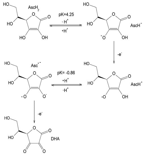 Ascorbic acid (AscH2) is mainly found in acidic conditions, e.g., the stomach environment, but the ascorbate anion (AscH−) predominates at physiological pH. Two other oxidation products of ascorbic acid, the ascorbyl radical (AscH•) and dehydroascorbate (DHA), are also found in the body in smaller quantities (Figure 1).