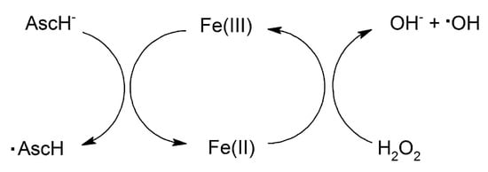 There are many examples describing the redox activity implications of a mixture of ascorbic acid with Fe2+ in the Fenton reaction [,,,,]. For example, the oxidation of benzoic acid by the Fenton reaction occurs more effectively in the presence of ascorbic acid []. It appears that the starting reaction rate of the ferrous–ascorbate complex with hydrogen peroxide is the same as free Fe2+. However, after Fe2+ was oxidized to Fe3+, the reaction rate decreased by about one order. It was concluded that in the presence of ascorbic acid the starting reaction rate is kept high due, to the fast reduction of Fe3+ [].