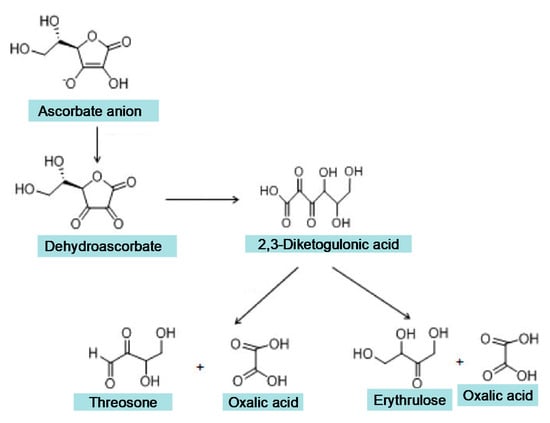 Different doses of ascorbic acid are generally used in clinical trials, and also by millions of people every day for antioxidant protection and other therapeutic effects. In addition to the molecular changes of ascorbic acid to ascorbate anion, ascorbic radical and DHA following redox reactions (Figure 1), oxalate is the major degradation, non-enzymatic breakdown product of ascorbic acid following oral and intravenous administration. The first step of ascorbic acid degradation to oxalate involves the formation of DHA, the second step the formation of 2,3-diketogulonic acid, and the final step the further breakdown of 2,3-diketogulonic acid to erythrulose, threosone and oxalic acid (Figure 4) []. It is estimated that about 50% of ascorbate is converted to oxalate and exclusively excreted in the urine. The amount of oxalate produced from ascorbic acid is about twice the amount produced normally from endogenous sources. It is estimated that the distribution of ascorbic acid and oxalate in a total of 15 L of plasma and extracellular compartments is 150 mg and 2.5 mg, in intracellular compartments of 25 L about 1.5 g and 50 mg, and in urine 20 mg and 30 mg, respectively []. Many reports suggest that particularly high oral or intravenous doses of ascorbic acid may cause oxalate nephropathy as a result of increased oxalate and oxalate–calcium complex formation []. It is also anticipated that under these conditions of high oxalate concentration, the metabolic pathways related to iron could also be affected, but no such observations have yet been studied or reported.