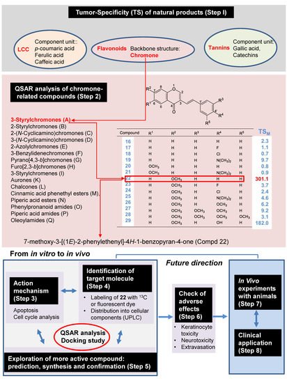 In order to explore more potent chromone derivatives, the following three steps will be repeated: (i) prediction by QSAR of the best fit substituents that yield the highest TSM and TSE, (ii) synthesis of compounds introduced with such predicted substituents, and (iii) confirmation of antitumor potential (Step 5). However, it is important to eliminate the compounds that show potent keratinocyte toxicity, neurotoxicity, and extravasation (Step 6), before animal experiment (Step 6) and clinical application (Step 7).