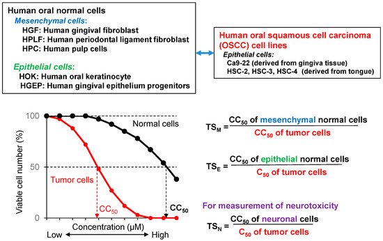 For the quantification of anticancer activity of text samples, it was necessary to establish the in vitro assay method (Figure 2) [22], using human malignant and nonmalignant cells: four human oral squamous cell carcinoma (OSCC) cell lines (Ca9-22, HSC-2, HSC-3, and HSC-4), three human normal oral mesenchymal cells (gingival fibroblast HGF, periodontal ligament fibroblast HPLF, and pulp cell HPC), and two human normal oral epithelial cells (human oral keratinocyte HOK and primary human gingival epithelial cells HGEP).