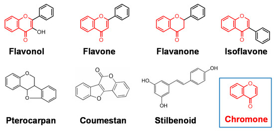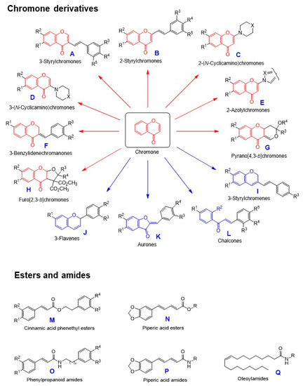 As for chromone derivatives, 3-styrylchromones (A) were synthesized by Knoevenagel condensation of the corresponding 3-formylchromones with various phenylacetic acid derivatives [23] (Figure 5).