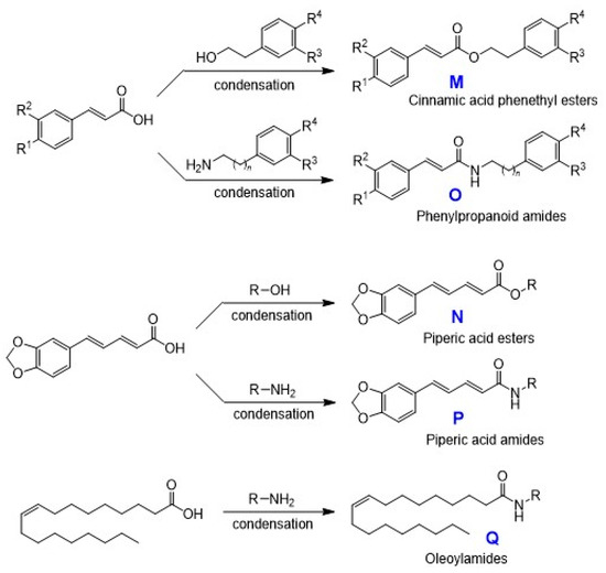 - Amides: phenylpronanoid amides (O), piperic acid amides (P), and oleoylamides (Q) (Figure 4).