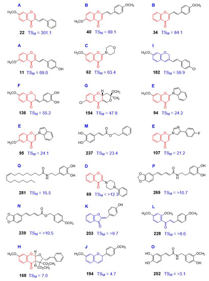 The present study demonstrated that only selected compounds that have the optimal 3D structure show the highest tumor specificity, whereas most of other analogs that have similar structure show much less tumor specificity (Supplementary Table S1). This suggests the presence of binding components or receptors for chromones. It remains to be investigated whether compounds 22 and 40 may interact with estrogen receptors, since these compounds have structural similarity with isoflavones (such as daidzein and genistein) and to some degree with tamoxifen, which have been used for the treatment of oral squamous cell carcinoma that express estrogen receptors [65,66,67]. In addition, it seems that the “para” like substitution is favorable, possibly because it mimics the structure of estrogen. It is highly probable that different groups of chromone-related compounds have different anticancer mechanisms depending on their structure (Table 6).