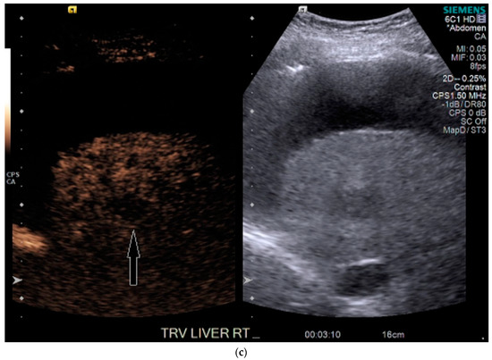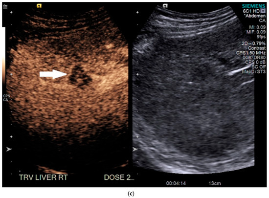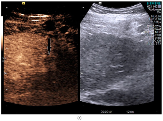 Patient 2 ultrasound images, with liver lesion denoted by black arrow: (a) grayscale images showing the hypoechoic lesion. Post contrast administration ultrasound in arterial phase (b) and early washout (c) of the lesion, LI-RADS M.