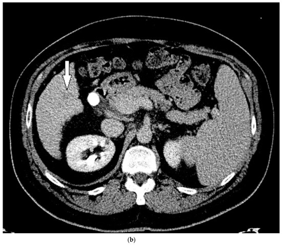 Patient 1 CT images using liver windows to highlight the subtle lesion easily seen on contrast-enhanced ultrasound (CEUS) (white arrow): (a) late arterial phase axial contrast-enhanced CT; (b) 3 min delayed phase.