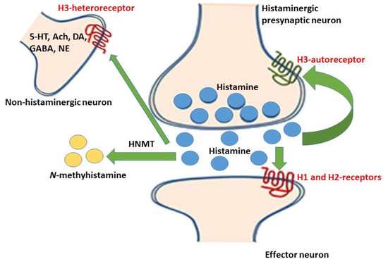 Released histamine (represented by the blue dots) from the histaminergic neurons bind to histamine-1 and -2 receptors on the effector neurons, while some are metabolized to the N-methylhistamine by the histamine N-methyltransferase (HNMT) enzyme. Some of the released histamine binds to the histamine-3 autoreceptors (on the histaminergic neurons) and the histamine-3 heteroreceptors (on the non-histaminergic neurons) thereby inhibiting the reuptake of released neurotransmitters. The central effect of this inhibition includes the enhancement of wakefulness, cognition, learning, and memory [13].