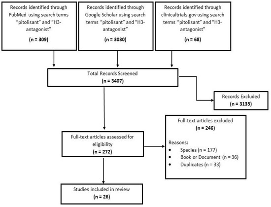 H3R antagonists are a new class of drugs with limited experience in clinical utility. Only 26 publications qualified for inclusion for extensive review for this study. Figure 2 shows the chart for the search details.