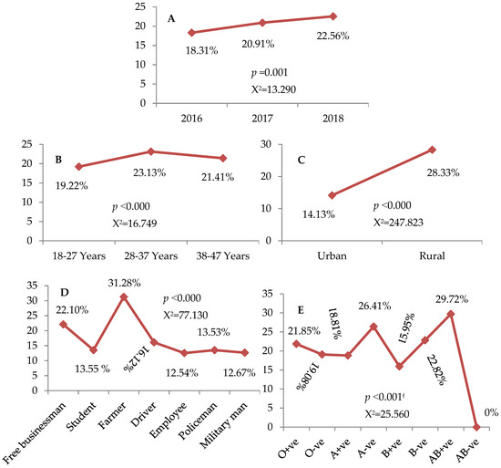 (A–E): Trend of the single serologic marker. (A): Throughout 2016 to 2018, (B): among age groups, (C): according to the residence, (D): in relation to occupations, (E): among blood groups and Rhesus factor. X2: chi-squared. Data assessed by the Pearson chi-squared and Fisher’s exact testsf.