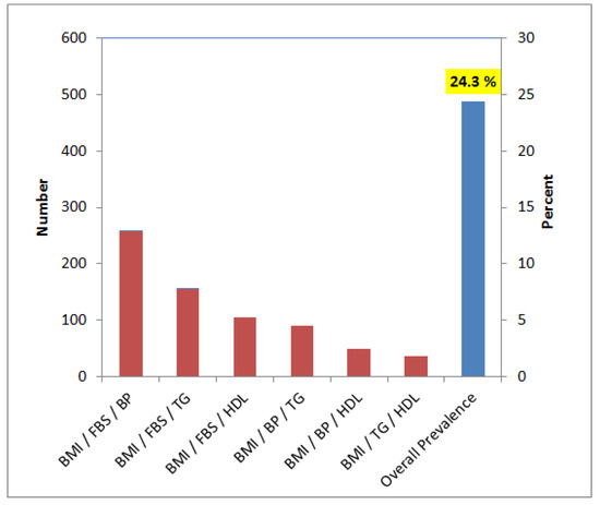 For the diagnosis of Met-S, six different triplets of associated components were used as a standard protocol. Specific cut-off values of these triplet parameters were used to filter subjects with Met-S. Among these triplets, BMI/FBS/BP identified 12.9% subjects affected with Met-S, followed by BMI/FBS/TG (7.8%), BMI/FBS/HDL (5.3%), BMI/BP/TG (4.5%), BMI/BP/HDL (2.5%) and BMI/TG/HDL (1.8%) (Table 7). The aggregate prevalence of Met-S was found to be 24.3% (Figure 1).