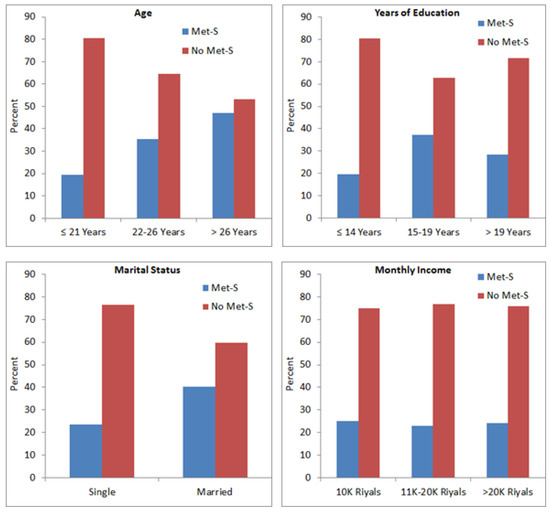 We observed significant association between Met-S and age (p = 0.001), education level (p = 0.001) and marital status (p = 0.003); however, monthly income (p = 0.761) was not associated with Met-S (Figure 2). There was a direct correlation between age and Met-S, as the subjects aged >26 years showed a high prevalence of Met-S compared to subjects ≤21 years. Subjects who received higher education showed comparatively higher frequency of Met-S than those who had received only school education (Figure 2). Married subjects showed significantly higher frequency of Met-S as compared to un-married subjects. The frequency of Met-S was almost the same in subjects with different income groups (Figure 2).